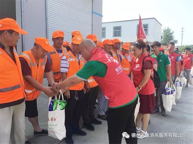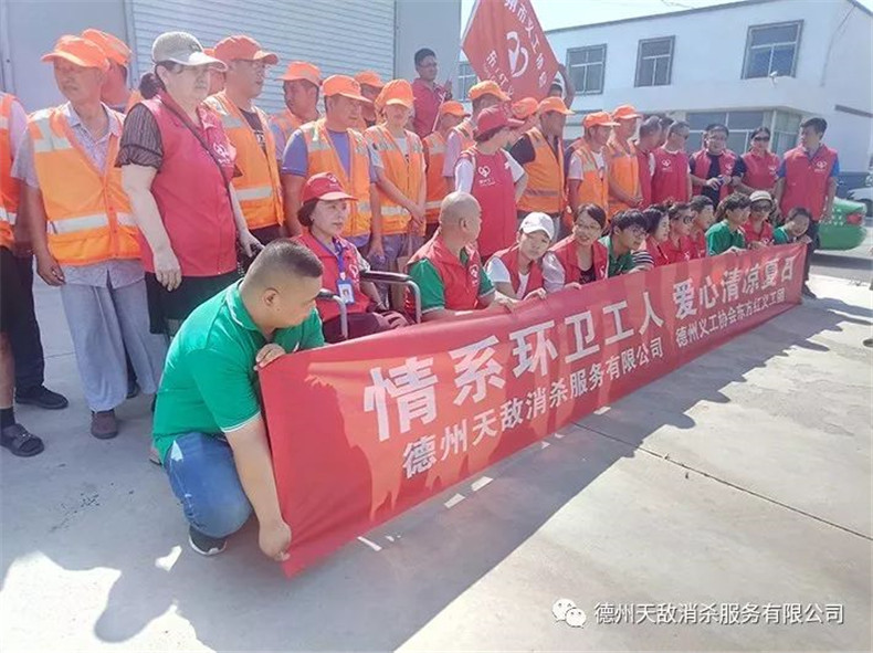 8月4號上午,天敵消殺服務有限公司,攜手東方紅義工團,來到德州市環境衛生管理處,為環衛工人送去愛心。環衛工人是我們每個城鎮不可缺少的一部分,他們每天辛勤的給我們美化著我們的城市,沒有他們就沒有我們干凈整潔的環境!