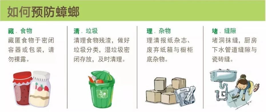 防患未然,應從居家細節入手。預防蟑螂可從“藏、清、理、堵”四個步驟做起。讓“打不死的小強”無處藏身。